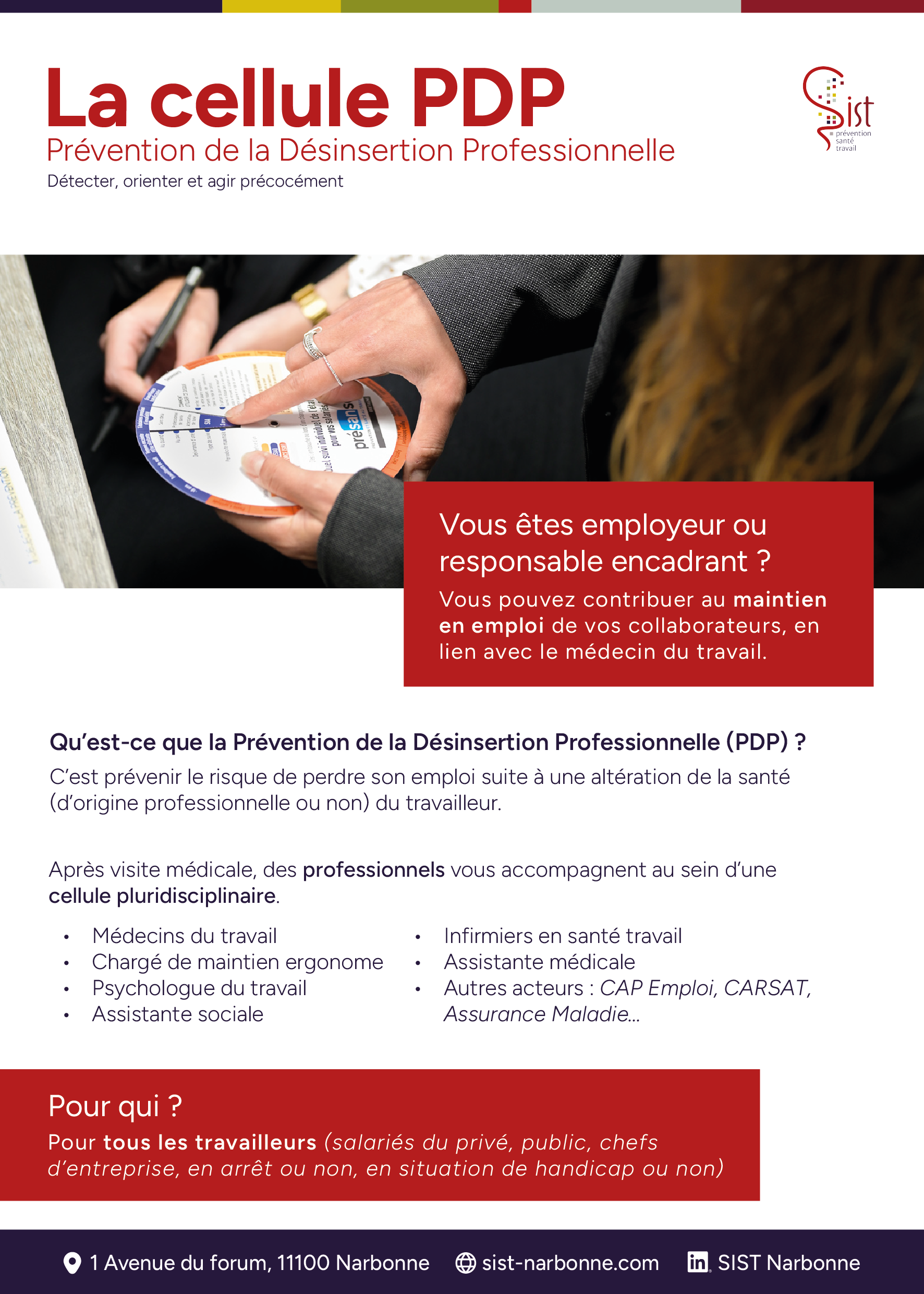 La cellule PDP accompagne les salariés et indépendants en difficulté au travail pour éviter une perte d’emploi liée à un problème de santé. Après une visite médicale, une équipe pluridisciplinaire (médecin du travail, ergonome, psychologue, assistant social, infirmiers…) peut intervenir pour évaluer la situation et proposer des solutions : aménagement du poste, aides techniques, reprise progressive, reconversion ou construction d’un nouveau projet professionnel. La cellule est accessible en activité ou pendant un arrêt de travail, via une visite à la demande ou une visite de pré-reprise. Pour toute question : pdp@sist-narbonne.com