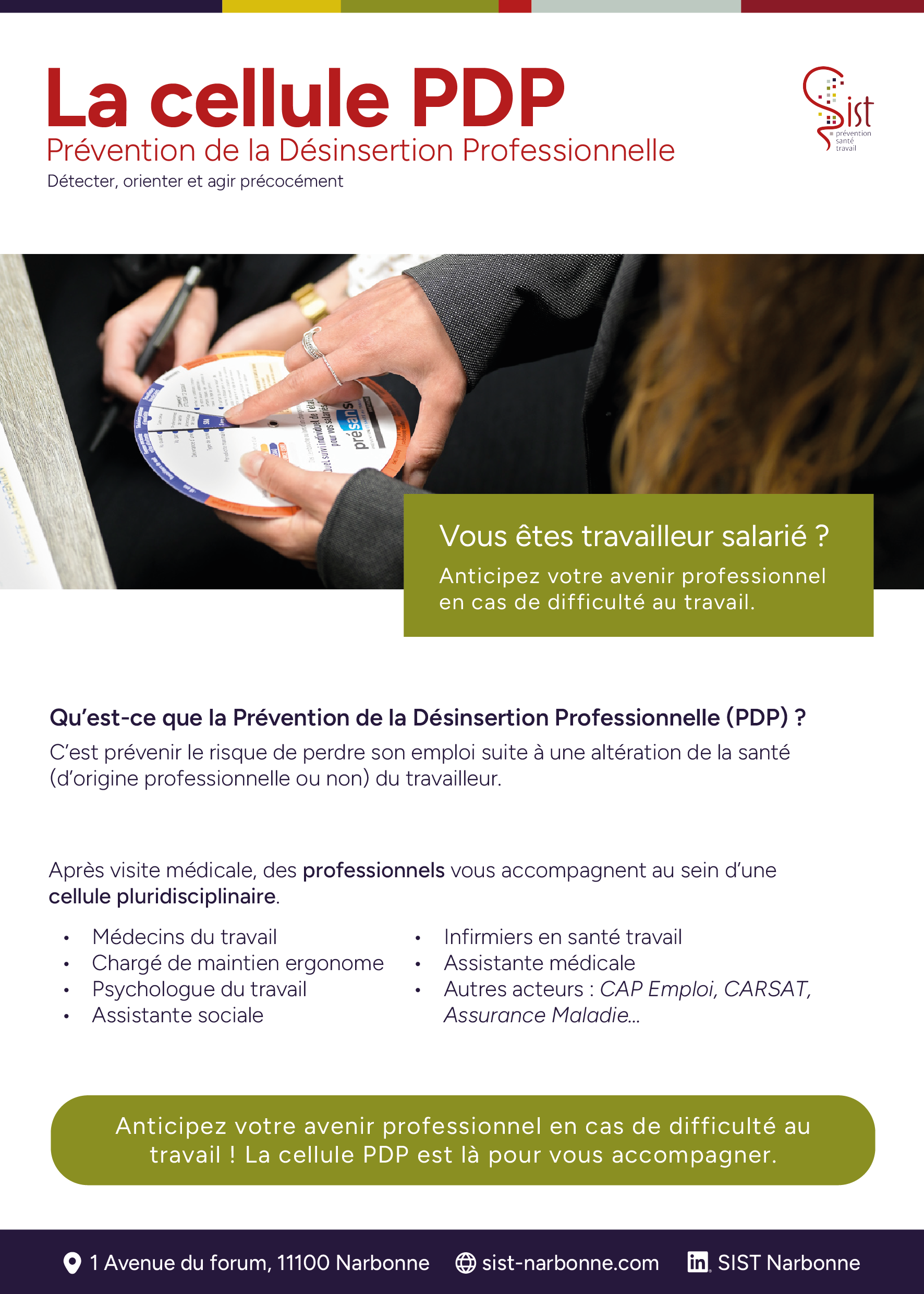 La cellule est accessible en activité ou pendant un arrêt de travail, via une visite à la demande ou une visite de pré-reprise. Pour toute question : pdp@sist-narbonne.com